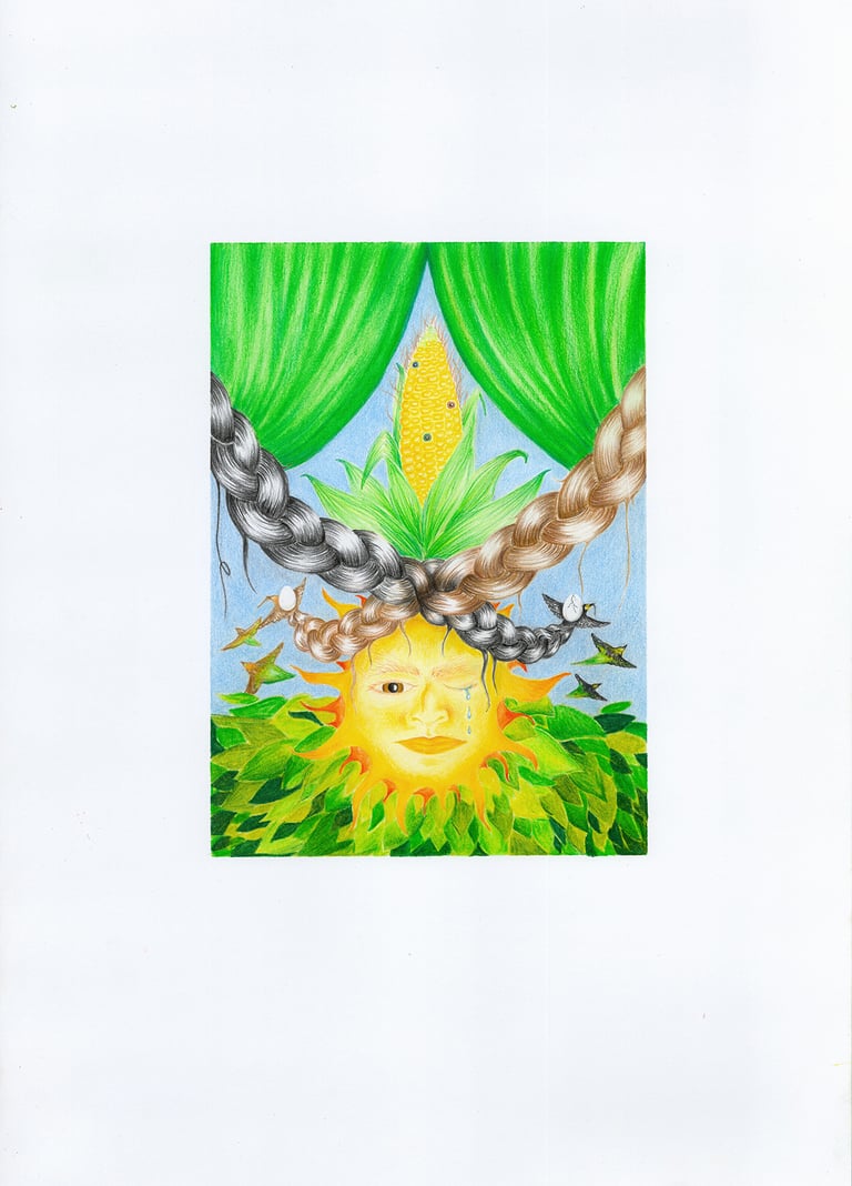 Lucila paints these pictures for her as yet unborn grandchildren, whom she will meet, as if she already knew that she would die far too soon in a car accident. She paints what she sees every day, her memories, her hopes of getting to know them, of conversations in other languages, of spirits that visit her. In her paintings she tells of the Colombia of her time, of the mountains and the sun she sees every day, of birds and of the forces from which she must flee.her paintings have never been seen, by any pair of eyes, no one knows of their existence. Only I, who never spoke to her, know of them, although I have never seen them. So I draw her pictures. What I carry of her in me remembers her pictures. Maybe I mix up motifs, maybe I don‘t remember everything, maybe I think of something (or everything), maybe she