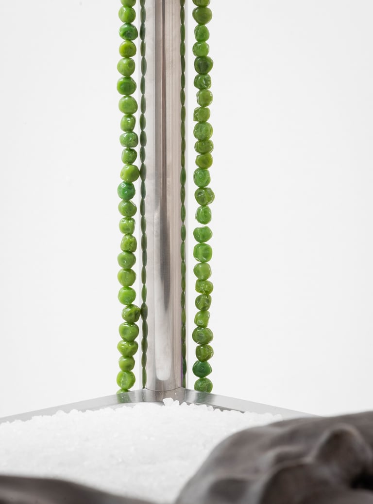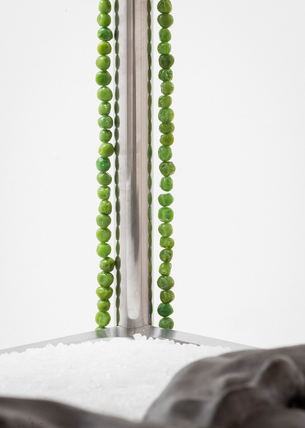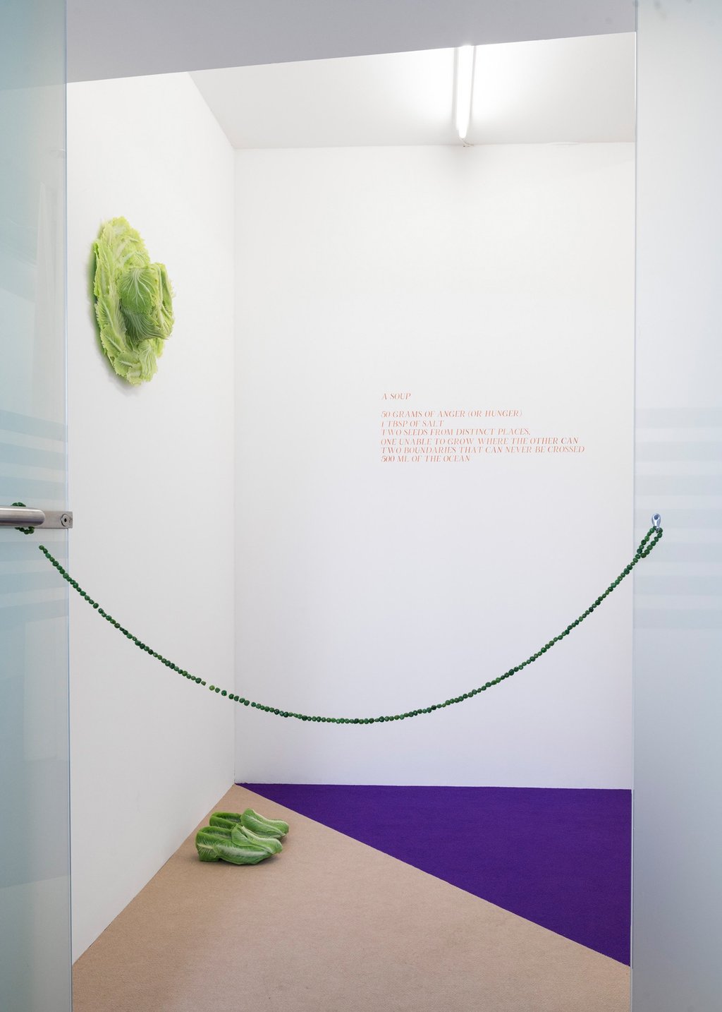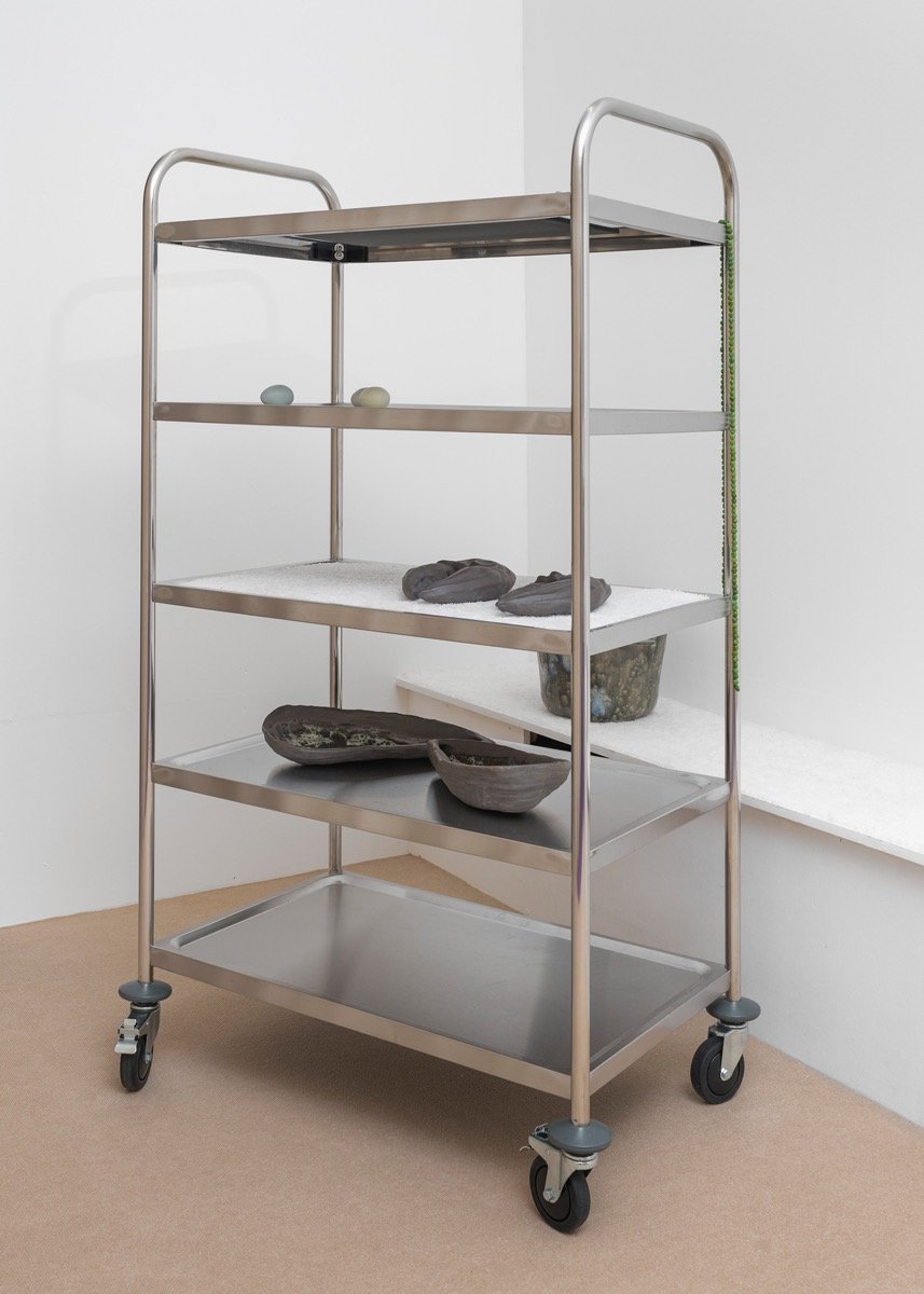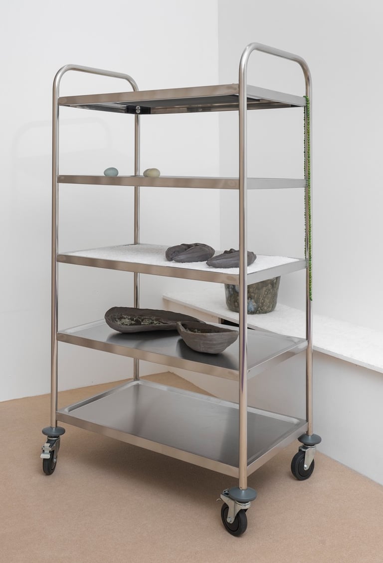 For the transitional site, Pacheco Dehne has made a series of new sculptures and ceramics, which she presents on abandoned serving trolleys in the context of already existing works. Confronted with Pacheco Dehne’s wall text A Soup (2022), a poetic recipe that tells of anger and hunger, a wavy curtain stretches out across from it. Silver plant seeds were tied between the fabric with milky threads. Above the carpet, which fragments the space and divides it into a beige-violet color field, several ceramic pots filled with salt stand on a ledge. The sound work Canción Sin Fin (2022) creates the background noise of an improvised cacerolazo, a practice from South America in which pots are banged on with spoons at demonstrations and protests.